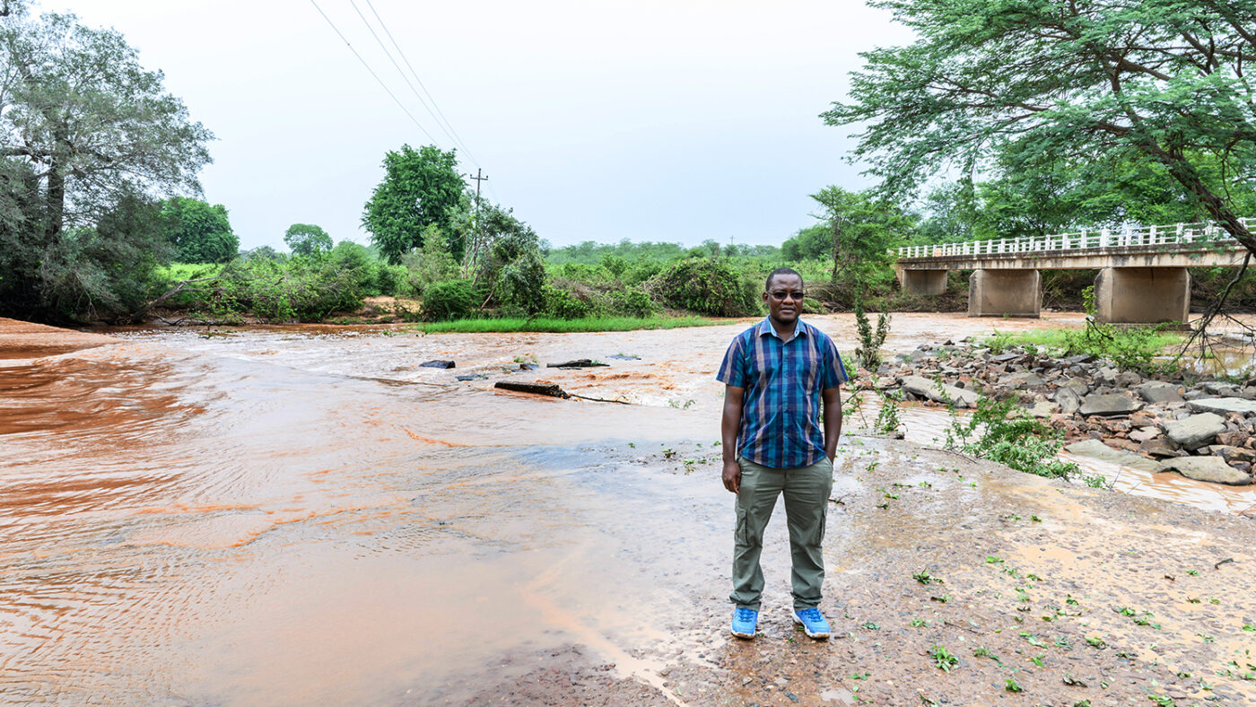 Senior programmes lead in Zimbabwe, Peter Bare, stands in front of a flooded road.