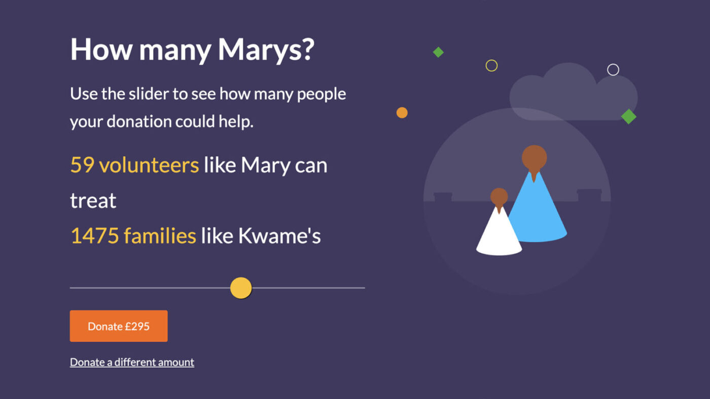 An interactive module enabling users to move the slider to show the impact of increasing or decreasing their donation. The numbers correlate to a donation amount that they are then prompted to donate.