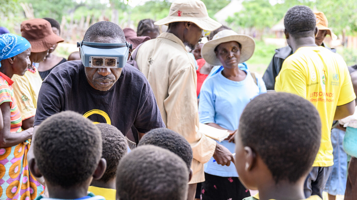 Ophthalmic nurse Jeremiah Gwafa screens community members' eyes for trachoma.