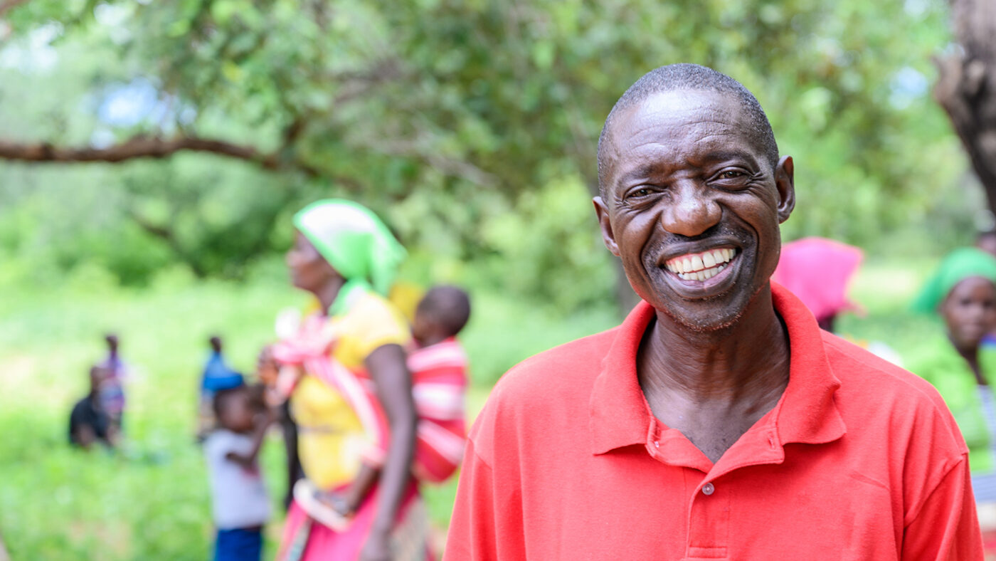 Ophthalmic nurse Jeremiah Gwafa smiles as he stands next to a local community member.